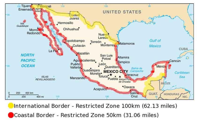 Previously, the Mexican constitution banned foreigners from owning property within 62 miles of any Mexican land border and 31 miles of any coastline. This was to prevent further loss of land and life after a long history of foreign invasion. These prohibited areas of ownership for foreigners are known as the “restricted zone”.