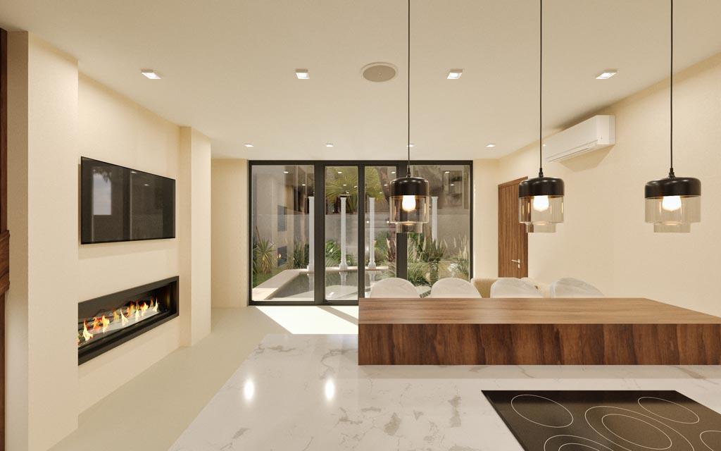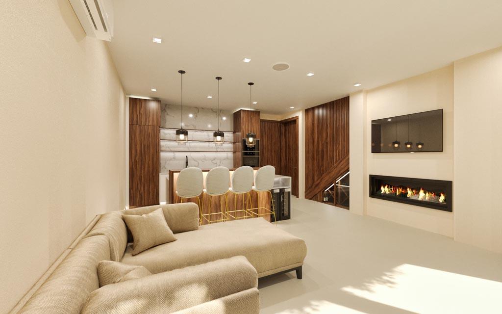 Lounge -> Washing machine / Wine Cellar / LED strip light on wall / Wood paneling / Integrated TV and Fireplace / Lock-off option.