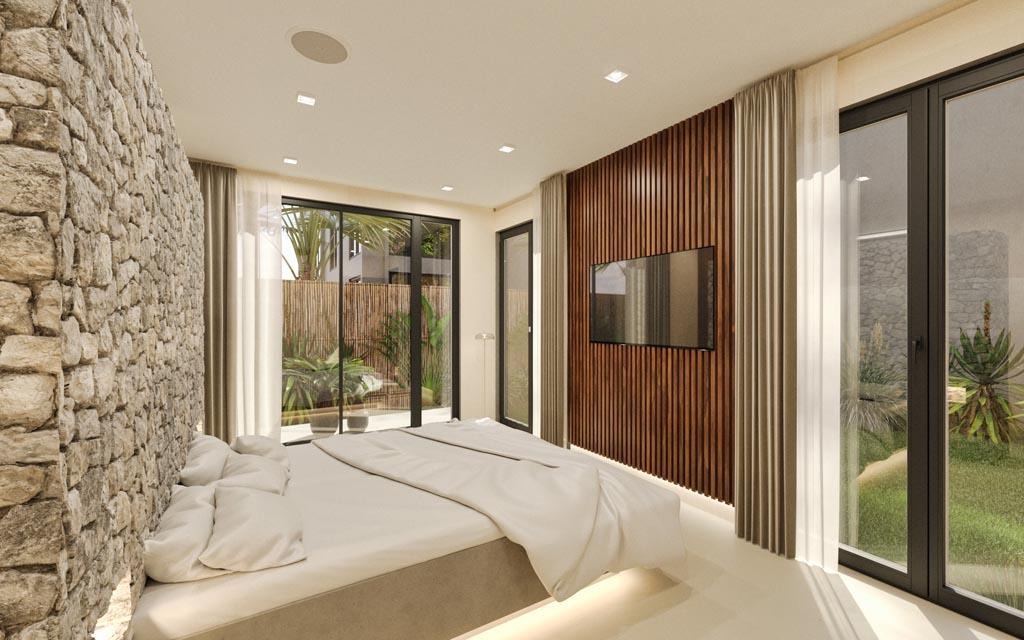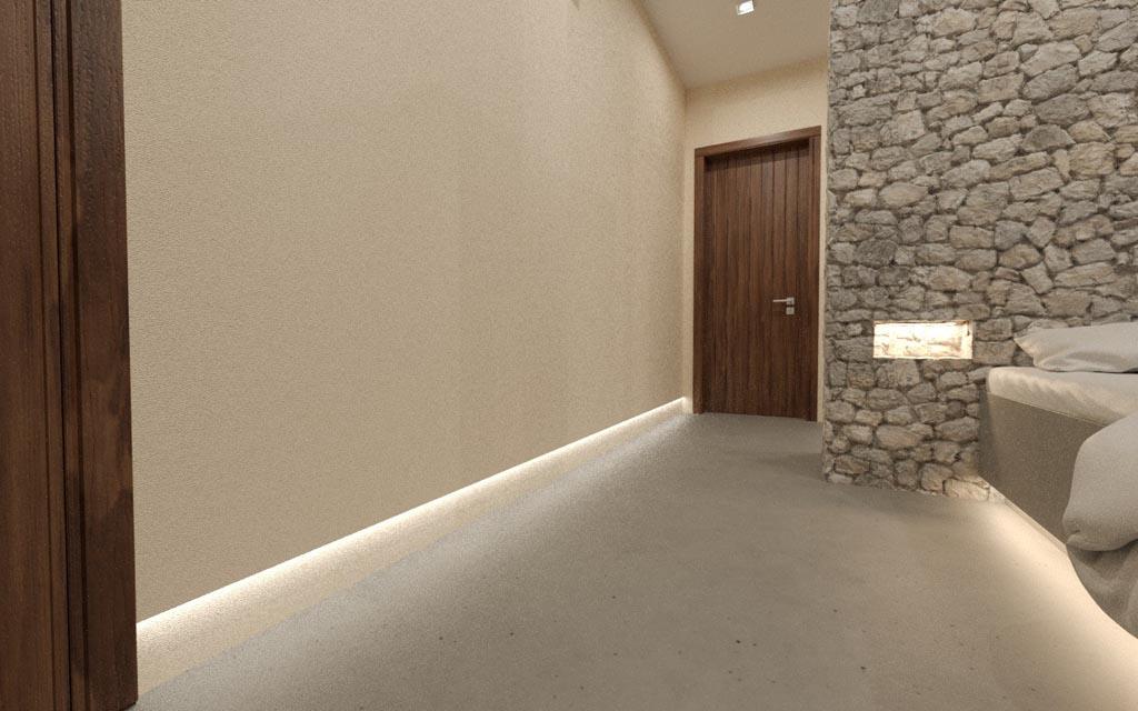 Bedrooms -> King-size beds with stone-black wall / integrated TV / USB charging points / Wardrobes with automatic light system / LED strip light on wall / LED bed lighting / Wood paneling / Hardwood doors / 50” TV