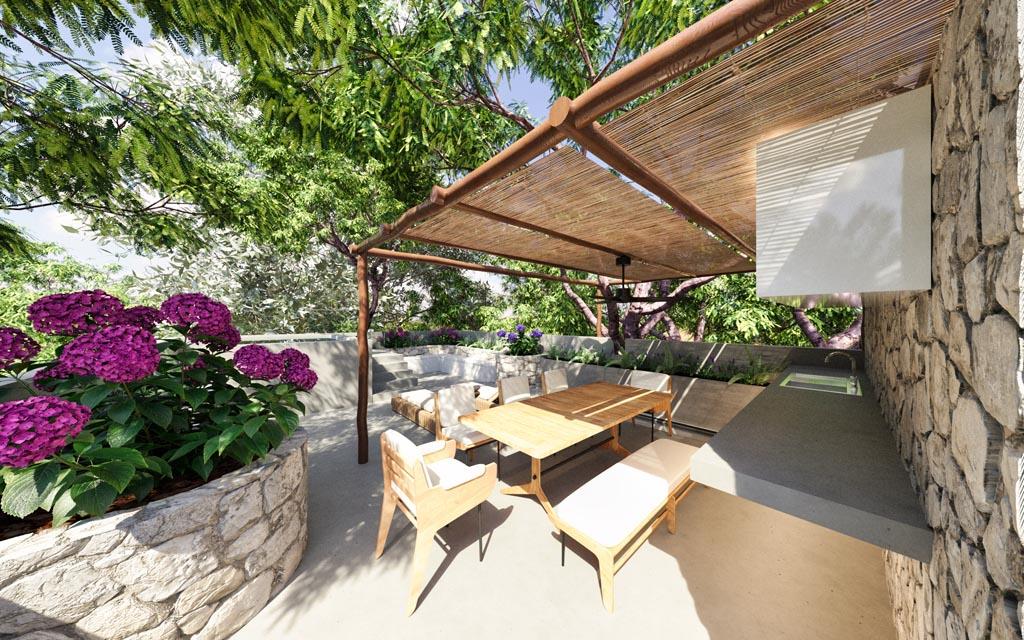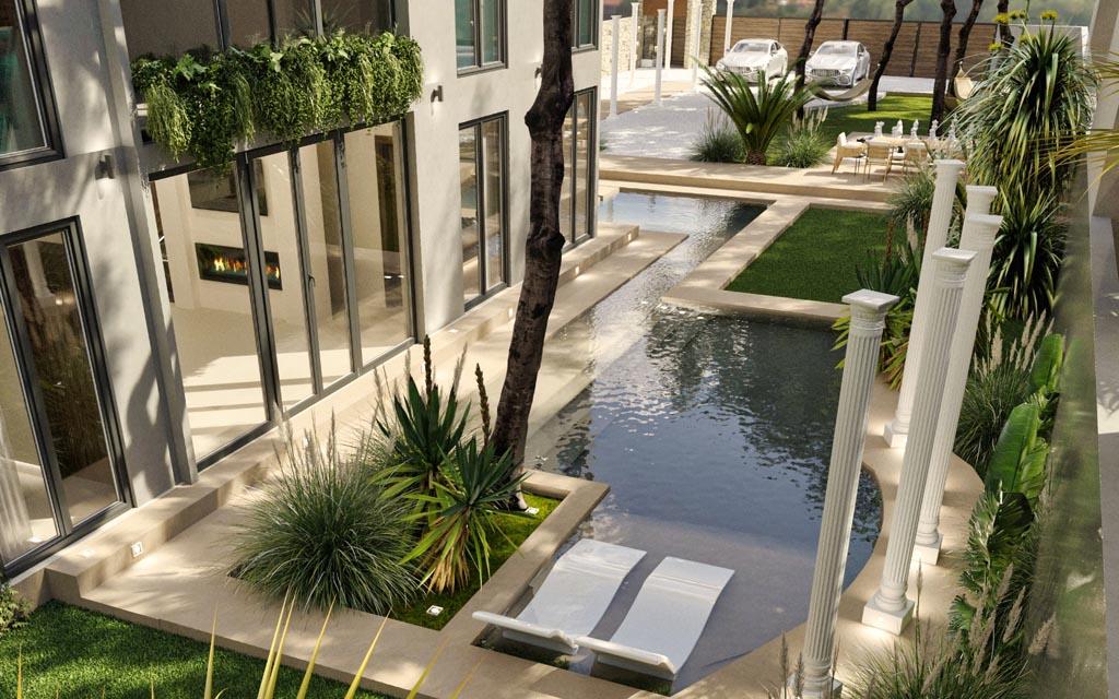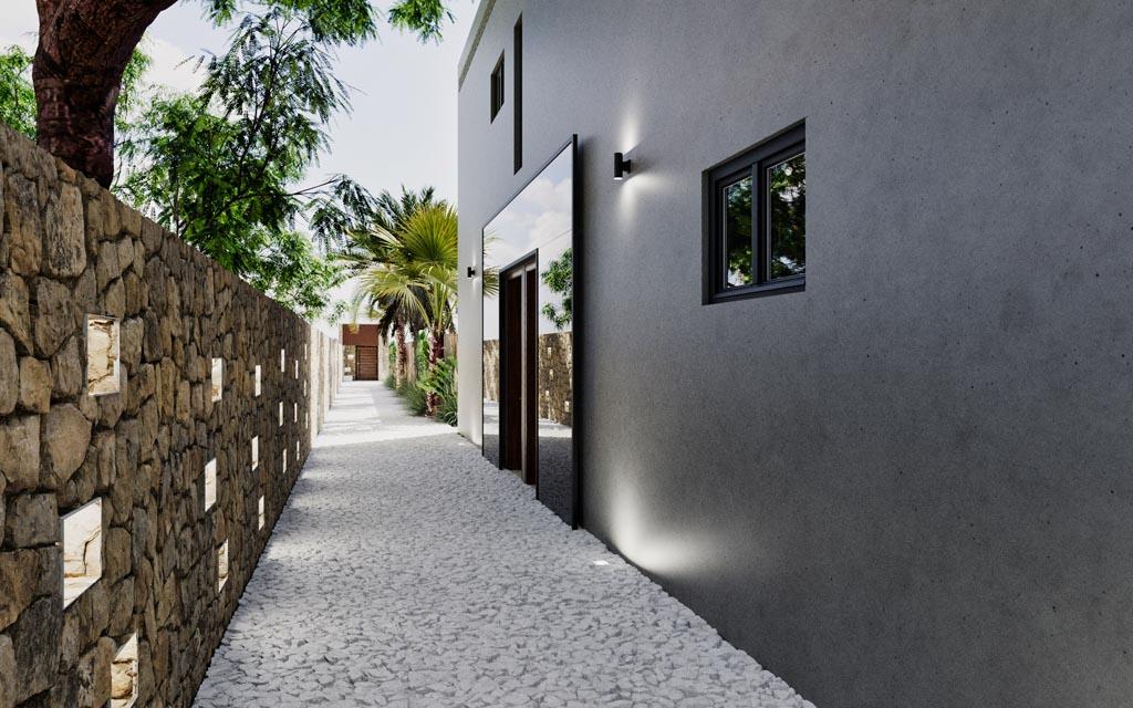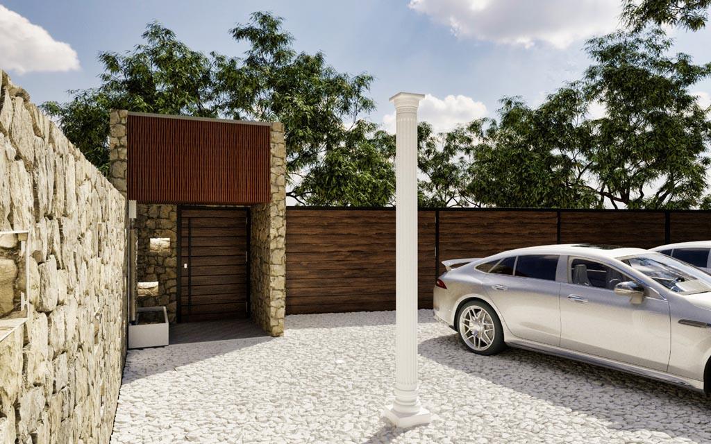 Driveway -> 400m2 / 8 private parking spaces / Lifesize chess / Romans columns / Independent lighting system / Music rock speakers / Stone driveway / Dining area / Hammock area / Trees / Ecological concrete.
