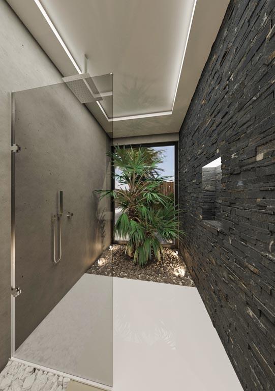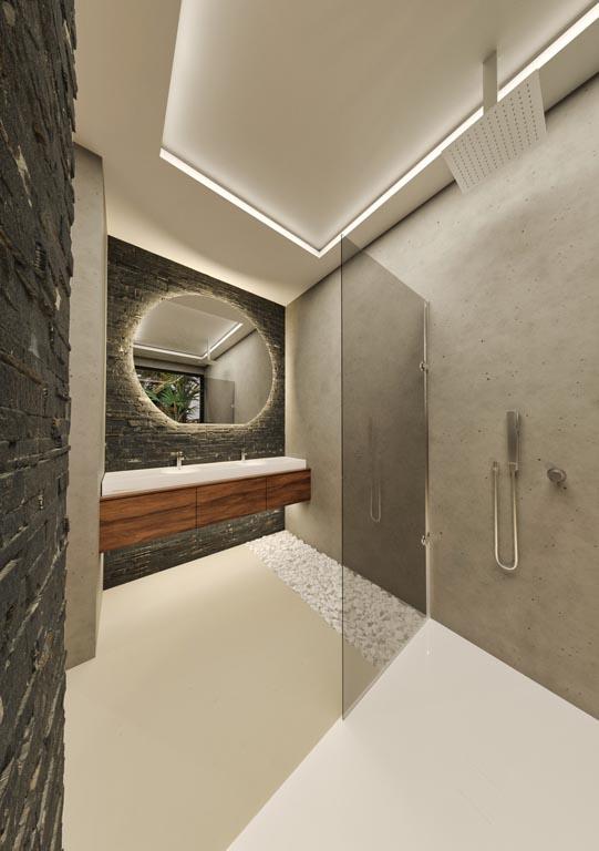 Bathrooms -> Floating double skin basin with LED lighting and cabinets / Rainfall shower / Inside garden plant feature with lights / Wall niche with light / Smoked glass shower screen / Extraction fan for odor and humidity / Two quartz tiles feature walls from Italy / Circular LED mirror / Waterfall sink taps / Full glass window / Stone area on the floor.