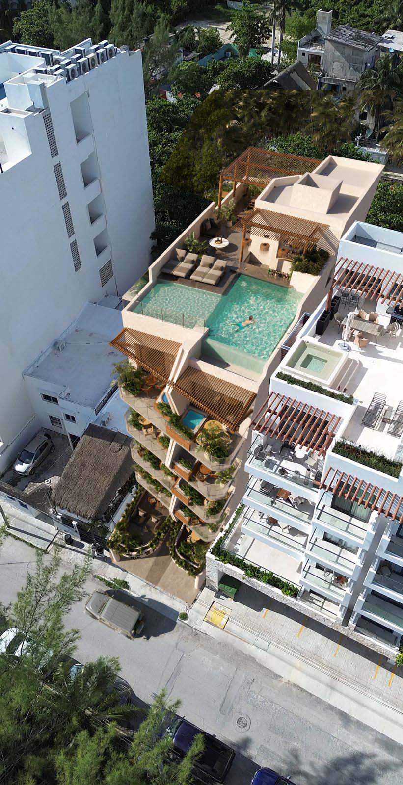 From marble finishes and tzalam wood accents to rooftop sunsets and bubbling jacuzzis, Thea blends timeless materials with modern perks. With the Cancun airport just 15 minutes away and the Maya Train station within easy reach, you’re as connected as you want to be.