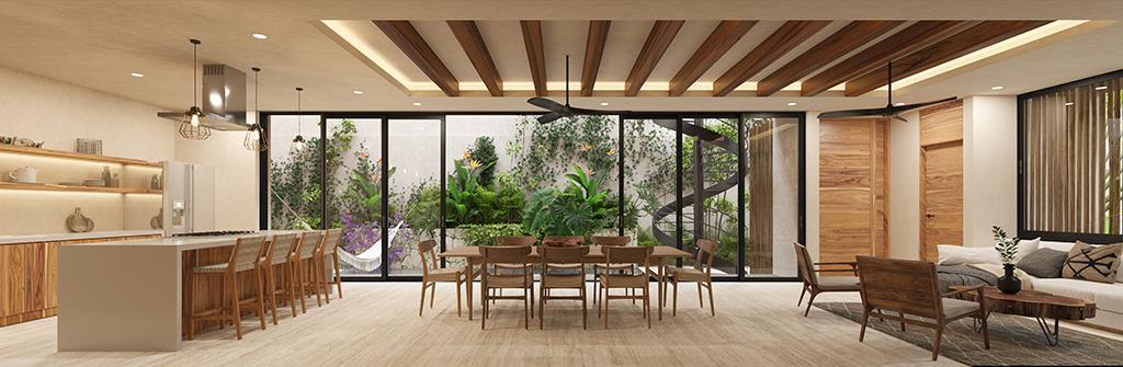 A space to be shared and enjoyed in an open living concept. Integration of indoor and outdoor areas makes this a perfect space for entertaining guests, highlighting the organic materials specific to this region. Wide-open living spaces combined with functionality, offer an ideal lifestyle to those who seek a premium residential experience in the most exclusive area of Tulum.
