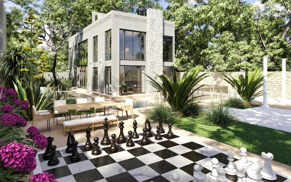 Driveway -> 400m2 / 8 private parking spaces / Lifesize chess / Romans columns / Independent lighting system / Music rock speakers / Stone driveway / Dining area / Hammock area / Trees / Ecological concrete.